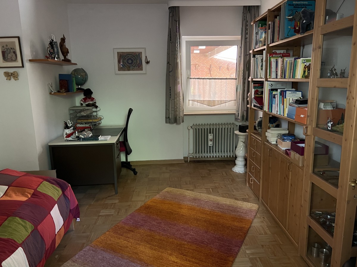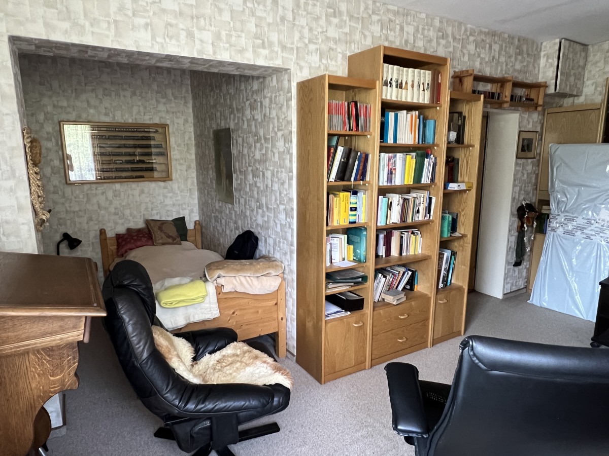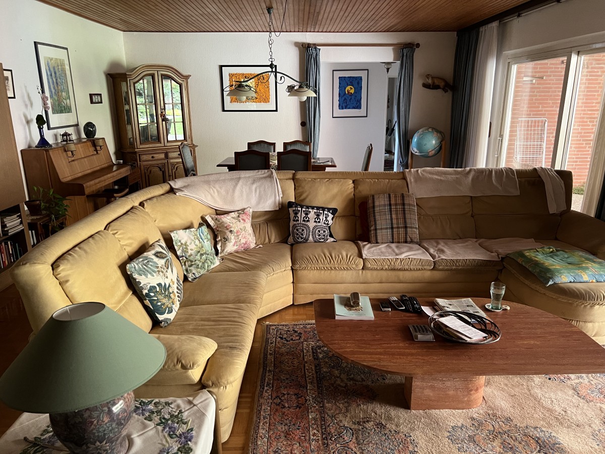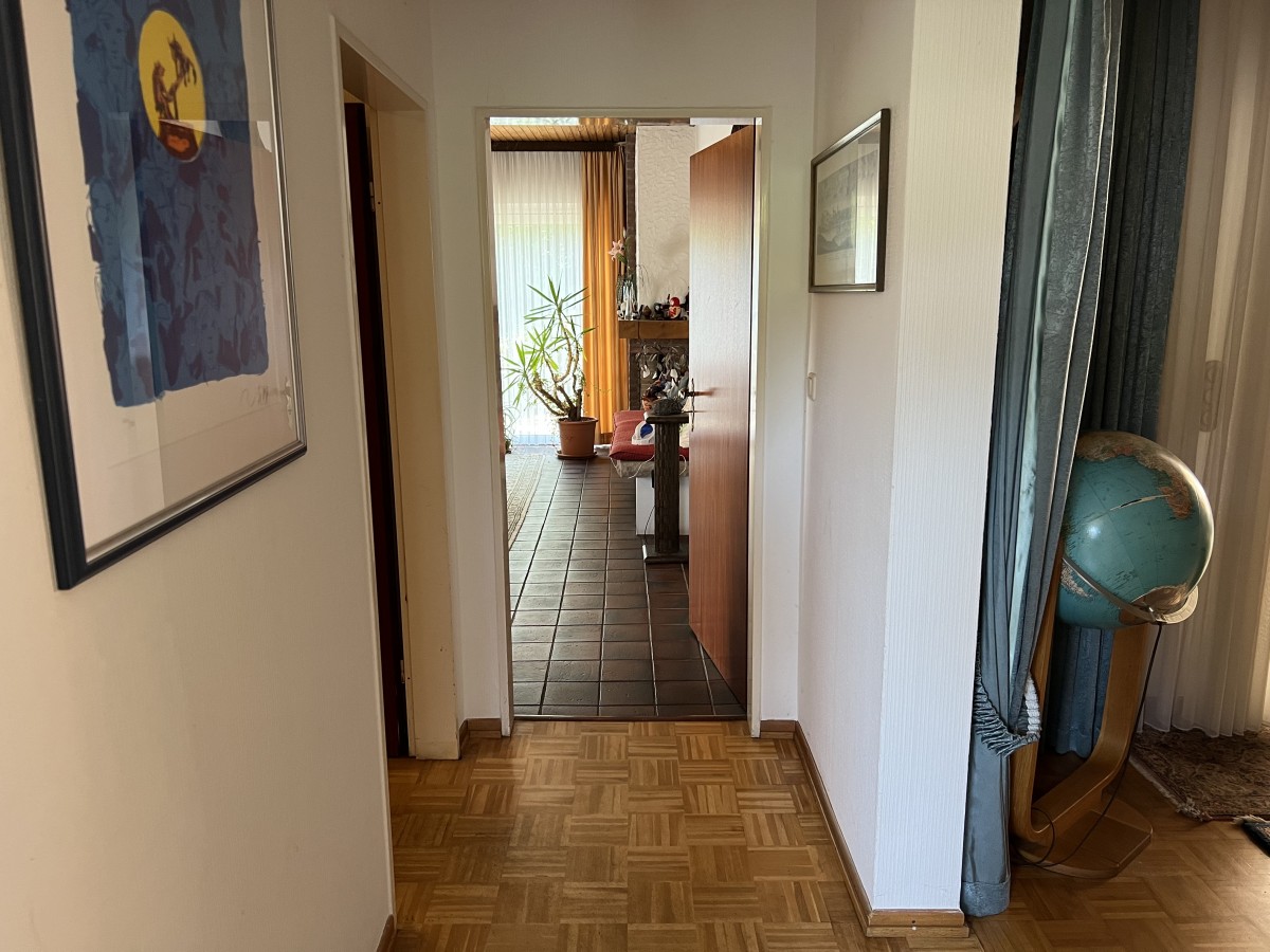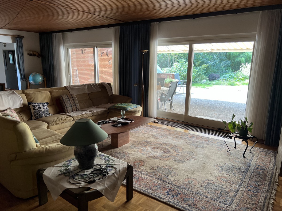 Aufgrund des besonderen Grundrisses bietet das Haus eine sehr einladende und angenehme Atmosphäre. Der große Eingangsbereich lässt Sie sich direkt willkommen fühlen. Von hier geht zur linken Seite ein großzügiges Zimmer ab, welches sich als Wohnbereich, oder zum Beispiel auch als Büro anbietet. Es gibt einen offenen Kamin, der für gemütliche Stunden sorgen kann und eine Schiebetür zur Gartenseite. Zur rechten Seite geht die Küche mit Einbauküche ab. Weiterführend gelangen Sie in den mit rund 52 m² sehr großzügigen Wohn- und Essbereich. Hier sorgen große Schiebetüren dafür, dass der gesamte Raum herrlich mit Tageslicht durchflutet wird und somit sehr hell und freundlich ist. Das Wohnzimmer entpuppt sich somit als Herzstück des Hauses und bietet Zugang zum gut bewachsenen Garten. Wenn Sie durch den Wohnbereich hindurchgehen, gelangen Sie in den hinteren Teil des Bungalows. Direkt vom Wohnzimmer geht hier die Diele ab, von der eines der Schlafzimmer sowie das separate WC und ein länglicher Flur abgehen. Über den Flur erreichen Sie zwei weitere Schlafzimmer, das große Badezimmer und über eine Treppe den Keller.