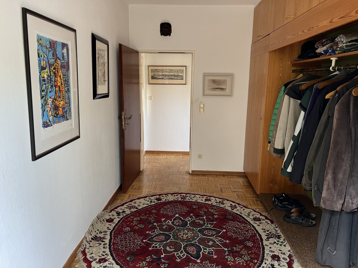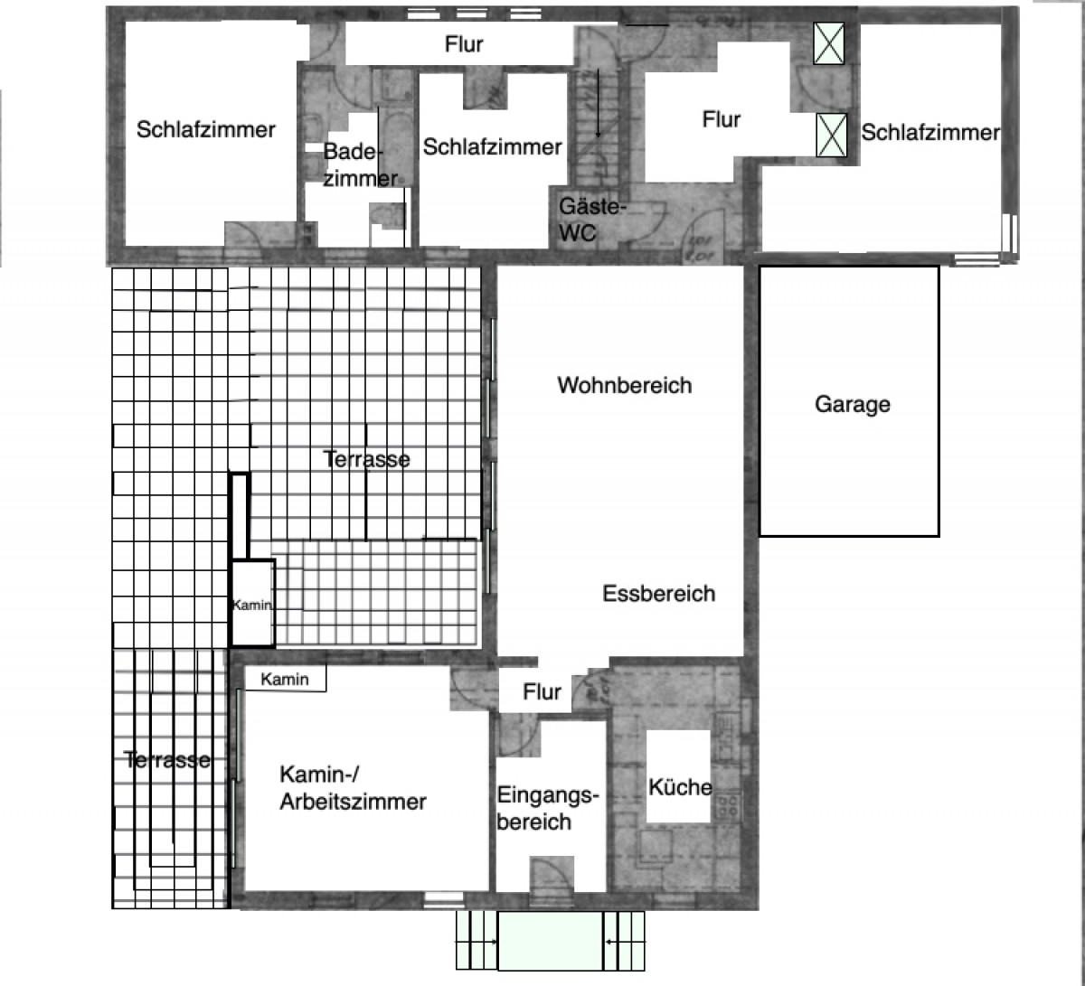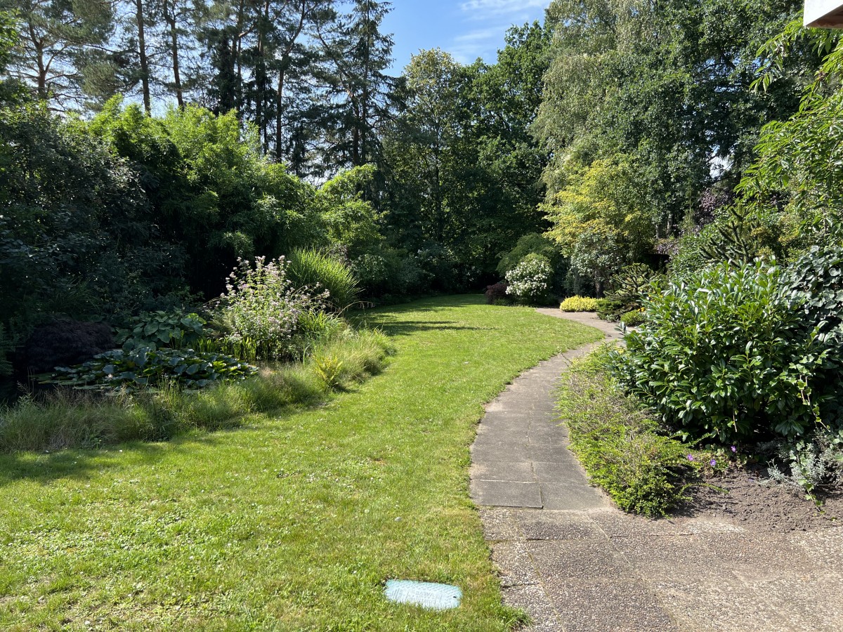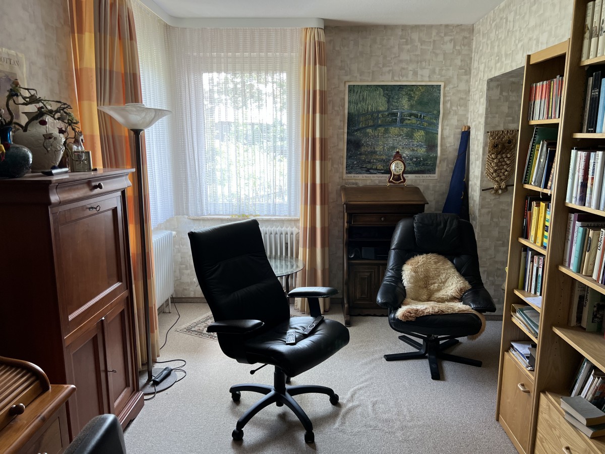 Aufgrund des besonderen Grundrisses bietet das Haus eine sehr einladende und angenehme Atmosphäre. Der große Eingangsbereich lässt Sie sich direkt willkommen fühlen. Von hier geht zur linken Seite ein großzügiges Zimmer ab, welches sich als Wohnbereich, oder zum Beispiel auch als Büro anbietet. Es gibt einen offenen Kamin, der für gemütliche Stunden sorgen kann und eine Schiebetür zur Gartenseite. Zur rechten Seite geht die Küche mit Einbauküche ab. Weiterführend gelangen Sie in den mit rund 52 m² sehr großzügigen Wohn- und Essbereich. Hier sorgen große Schiebetüren dafür, dass der gesamte Raum herrlich mit Tageslicht durchflutet wird und somit sehr hell und freundlich ist. Das Wohnzimmer entpuppt sich somit als Herzstück des Hauses und bietet Zugang zum gut bewachsenen Garten. Wenn Sie durch den Wohnbereich hindurchgehen, gelangen Sie in den hinteren Teil des Bungalows. Direkt vom Wohnzimmer geht hier die Diele ab, von der eines der Schlafzimmer sowie das separate WC und ein länglicher Flur abgehen. Über den Flur erreichen Sie zwei weitere Schlafzimmer, das große Badezimmer und über eine Treppe den Keller.