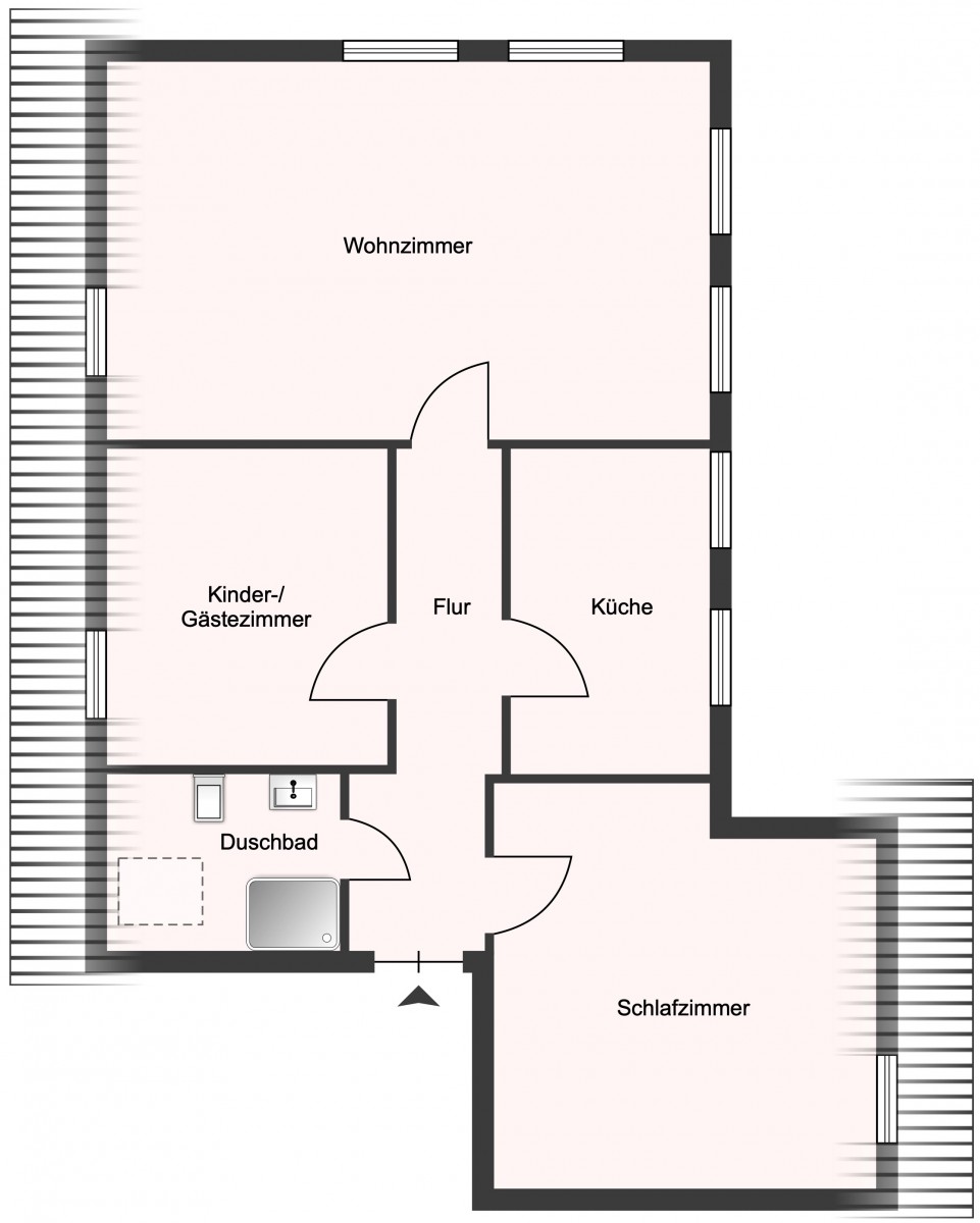 Die Wohnung verfügt über eine gut durchdachte Raumaufteilung. Vom Flur gehen alle Räume ab, was eine praktische Nutzung ermöglicht, und für eine klare Struktur sorgt.