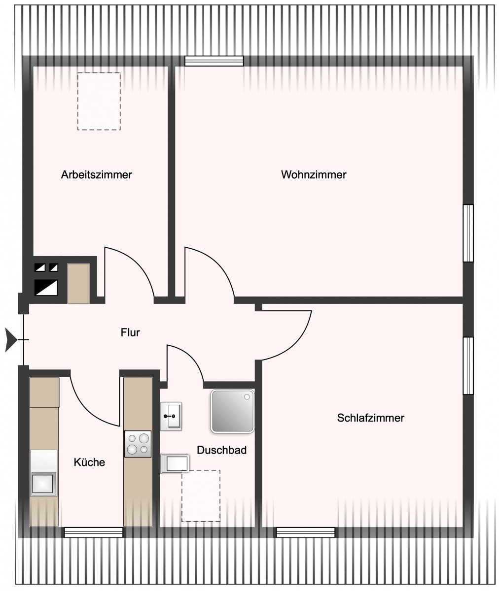 Die Wohnung hat eine schöne Aufteilung. Alle Räume gehen vom Flur der Wohnung ab. Durch die Dachschrägen entsteht von ganz allein eine sehr heimelige Atmosphäre. Das Wohnzimmer und das Schlafzimmer haben jeweils zwei Fenster, die für eine schöne Belichtung sorgen. Im Badezimmer und im Arbeitszimmer sind jeweils Veluxfenster vorhanden.