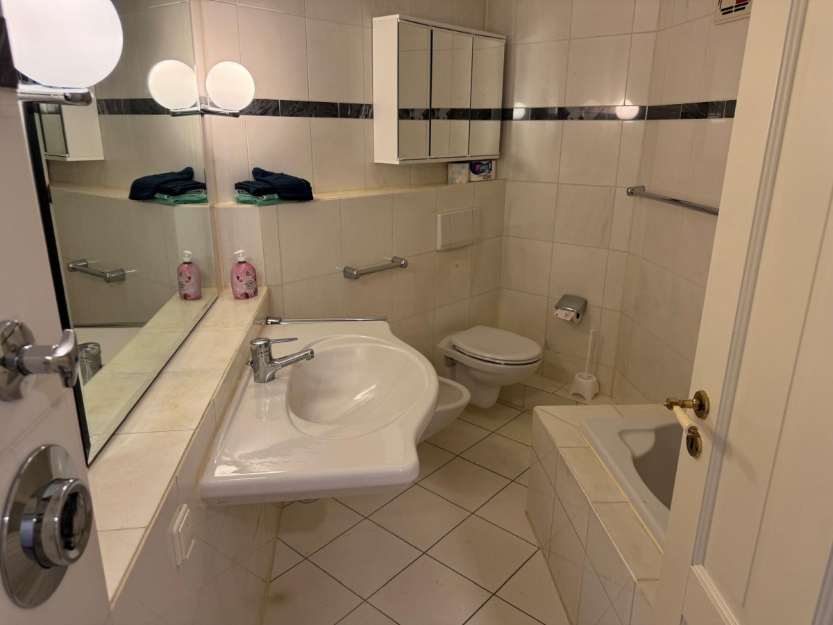 • Badezimmer mit freihängendem WC, Bidet, Waschtisch und Whirlpoolwanne.