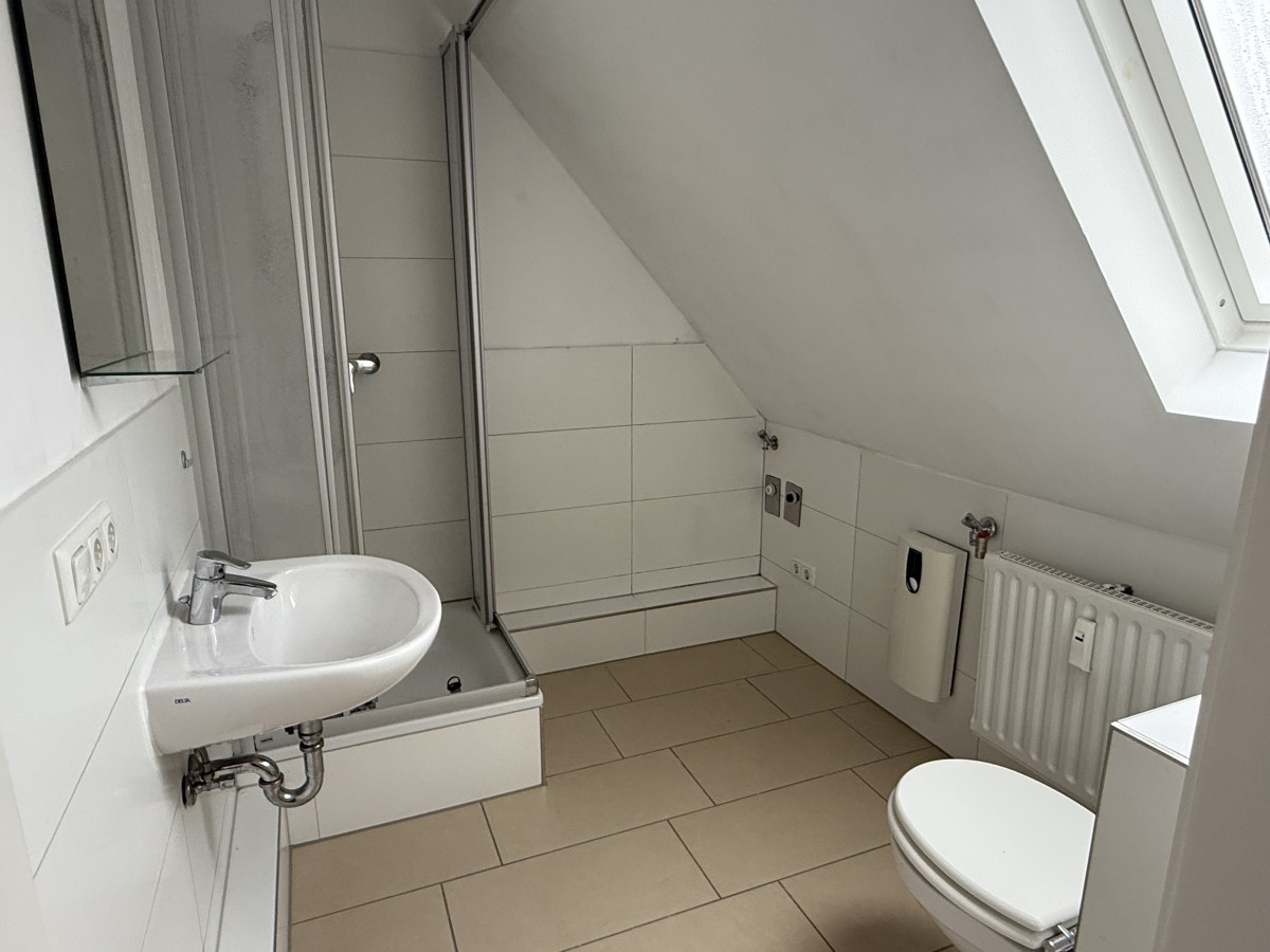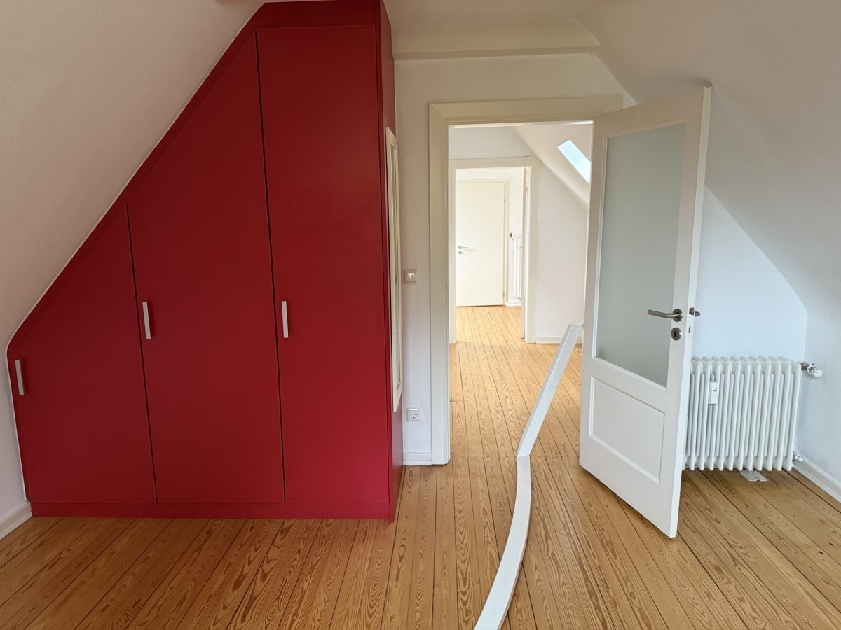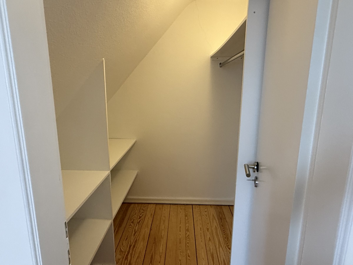 Im oberen Bereich der Wohnung befindet sich ein weiteres Schlafzimmer. Ebenso befindet sich hier ein Durchgangszimmer von dem man in das Tageslicht Duschbad und einen kleineren Ankleideraum gelangt. Im Duschbad befindet sich der Anschluss für eine Waschmaschine. Zu der Wohnung gehört ein Kellerraum.