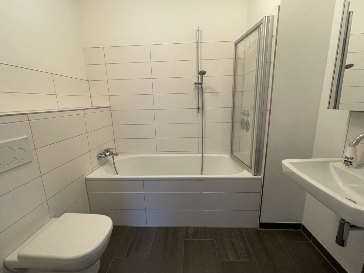 Das innenliegendes Badezimmer ist mit einer Badewanne ausgestattet. Das vom Eingangsbereich abgehende Gäste-WC hat ein Fenster. In den Zimmern sowie im Flur ist ein Parkettboden verlegt. Die Fußbodenheizung in der gesamten Wohnung sowie der Hauswirtschaftsraum mit Waschmaschinenanschluss und Stauraum rundet das komfortable und moderne Wohnen ab. Ein Kabel-TV-Anschluss ist vorhanden. Ein Dachbodenraum gehört ebenfalls zur Wohnung.