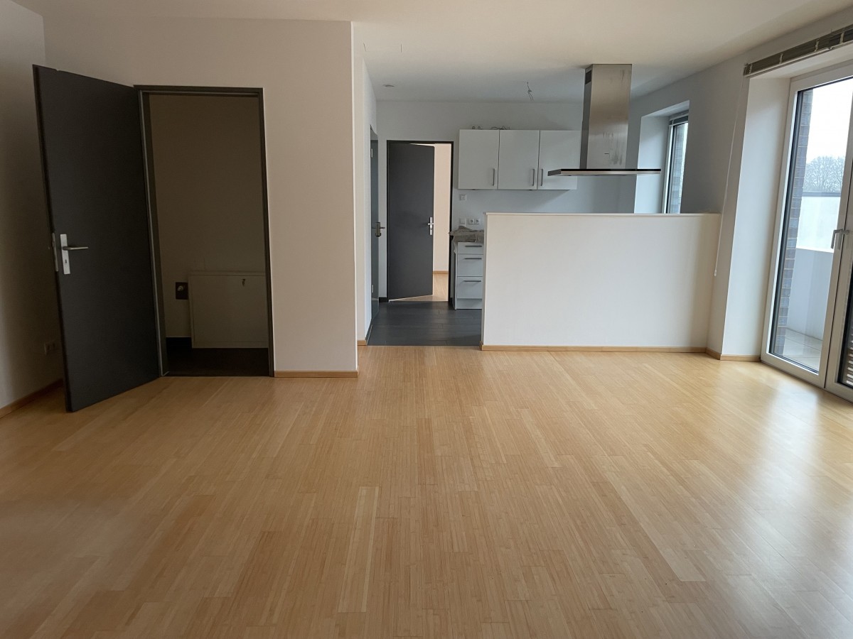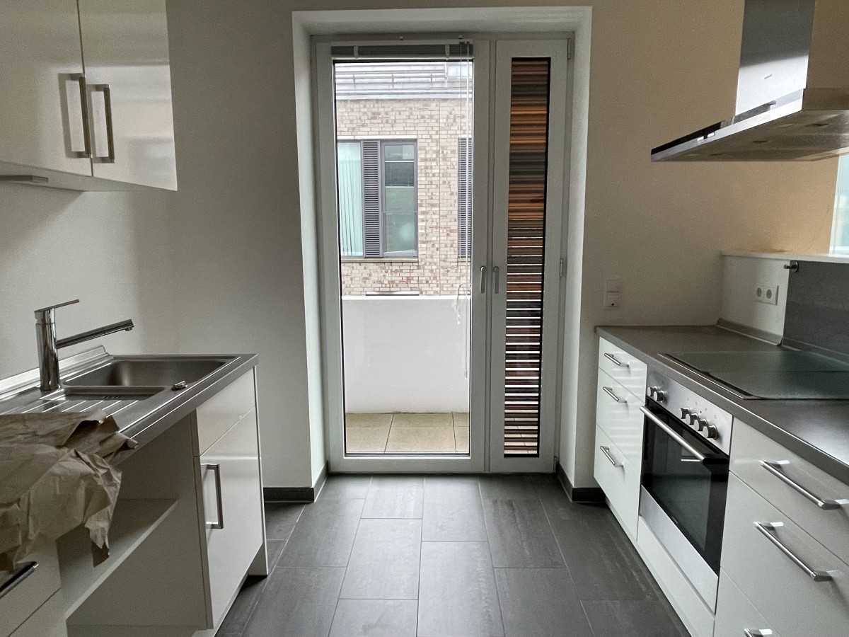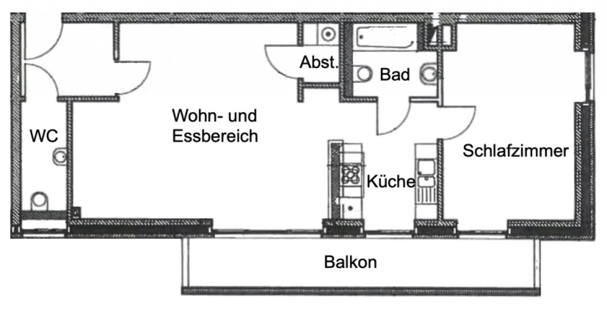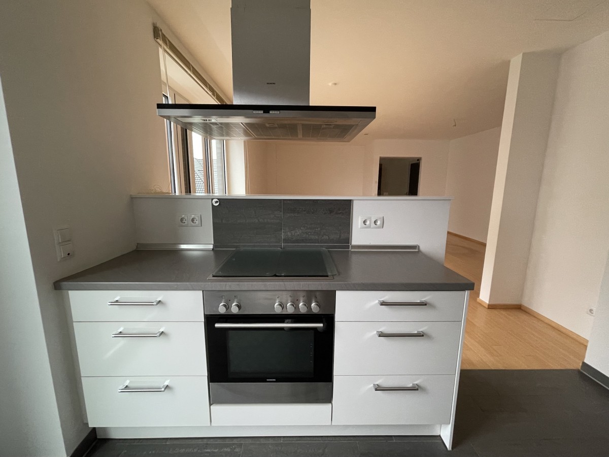 Das Wohn-/Esszimmer besticht durch seine Geräumigkeit und die großen Fensterflächen. Die Einbauküche inklusive Cerankochfeld, Backofen und Umlufthaube liegt offen zum Wohnzimmer und bietet einen Stellplatz für einen Geschirrspüler. Sowohl von Wohn- als auch Schlafzimmer sowie von der Küche ist der Süd-Balkon zu erreichen.