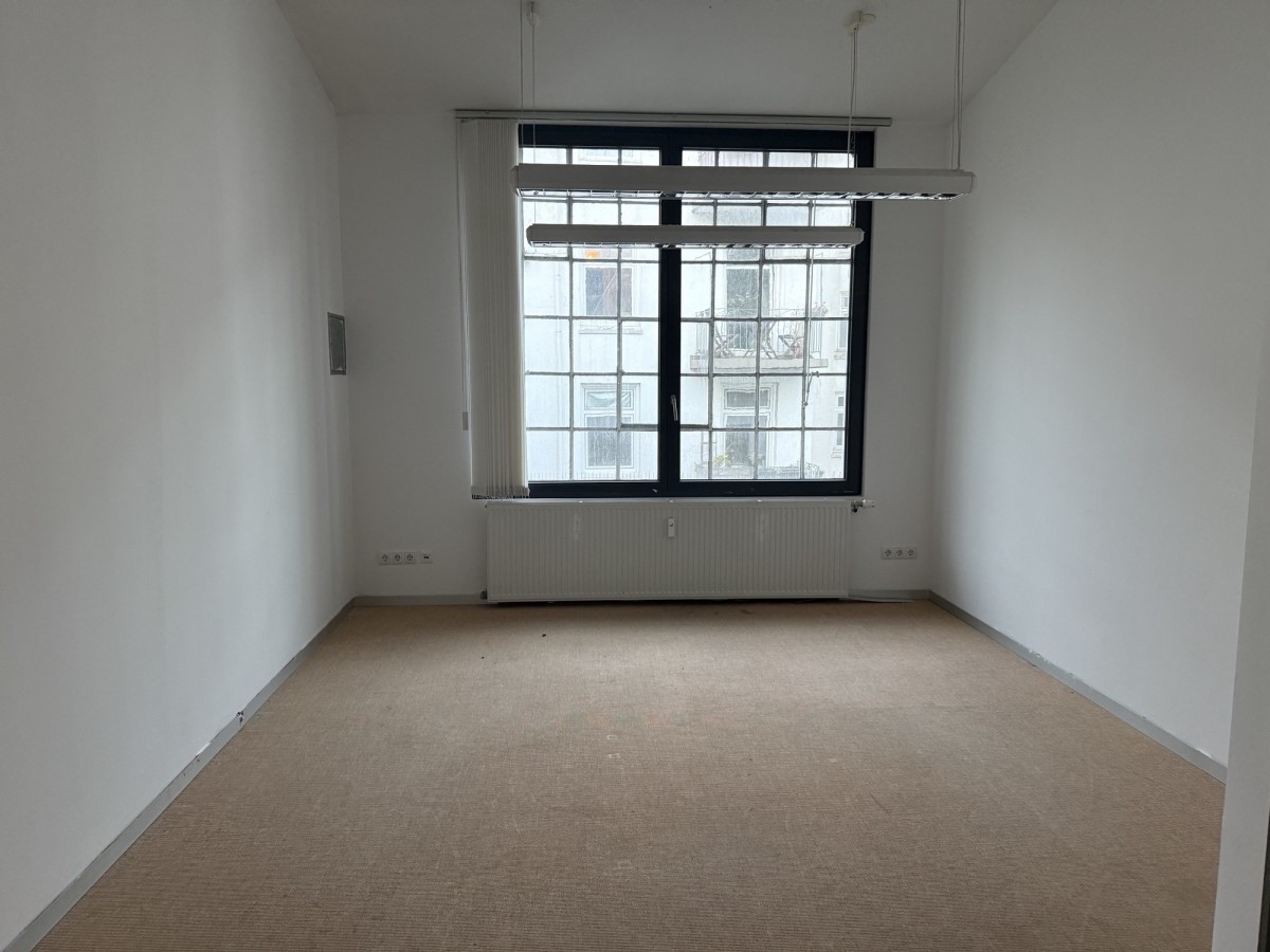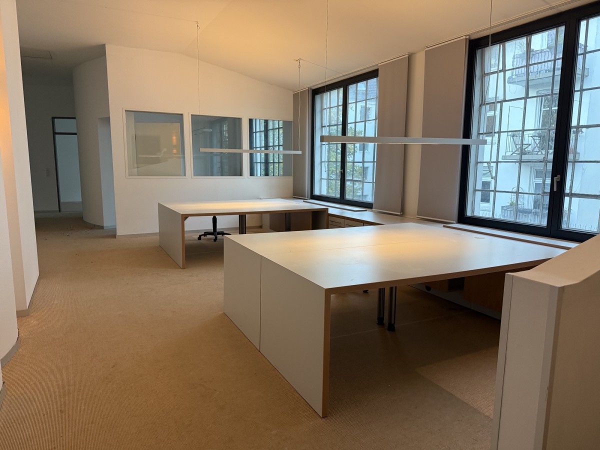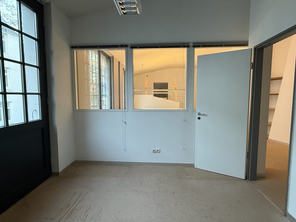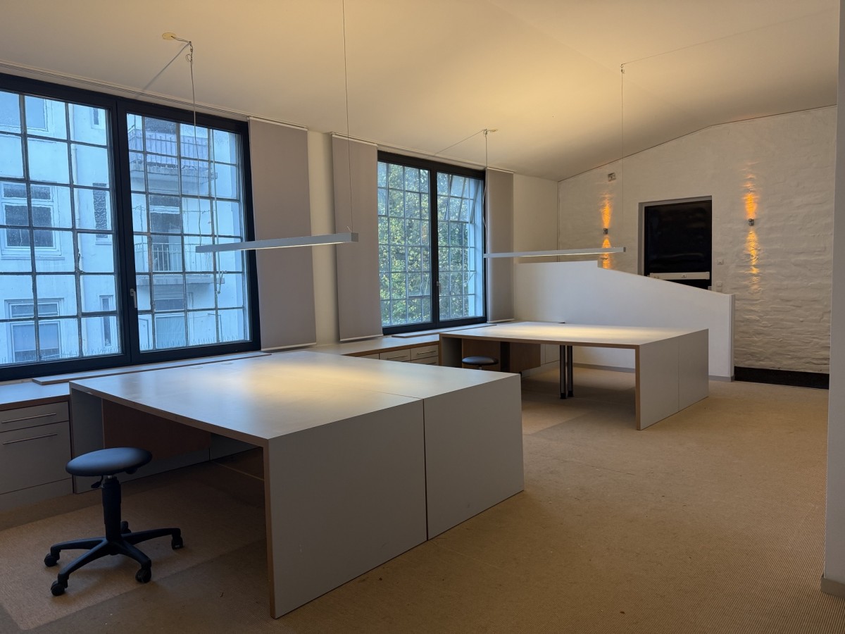 Die Bürofläche erstreckt sich über das gesamte 2. Obergeschoss des Hauses. Verteilt auf mehrere Räume und Nebenflächen bietet die Einheit vielfältige Nutzungsmöglichkeiten. Die vorhanden Leichtbauwände können ggf. entfernt und die Fläche somit individuell gestaltet werden. Die auf den Fotos zu sehenden Möbel und Einrichtungsgegenstände können unentgeltlich vom Mieter übernommen werden. Es sind eine Einbauküche mit Kochinsel sowie eine zusätzliche Teeküche vorhanden, ebenso ein Duschbad. Die zwei getrennten WC’s befinden sich außerhalb der Fläche im Treppenhaus.
