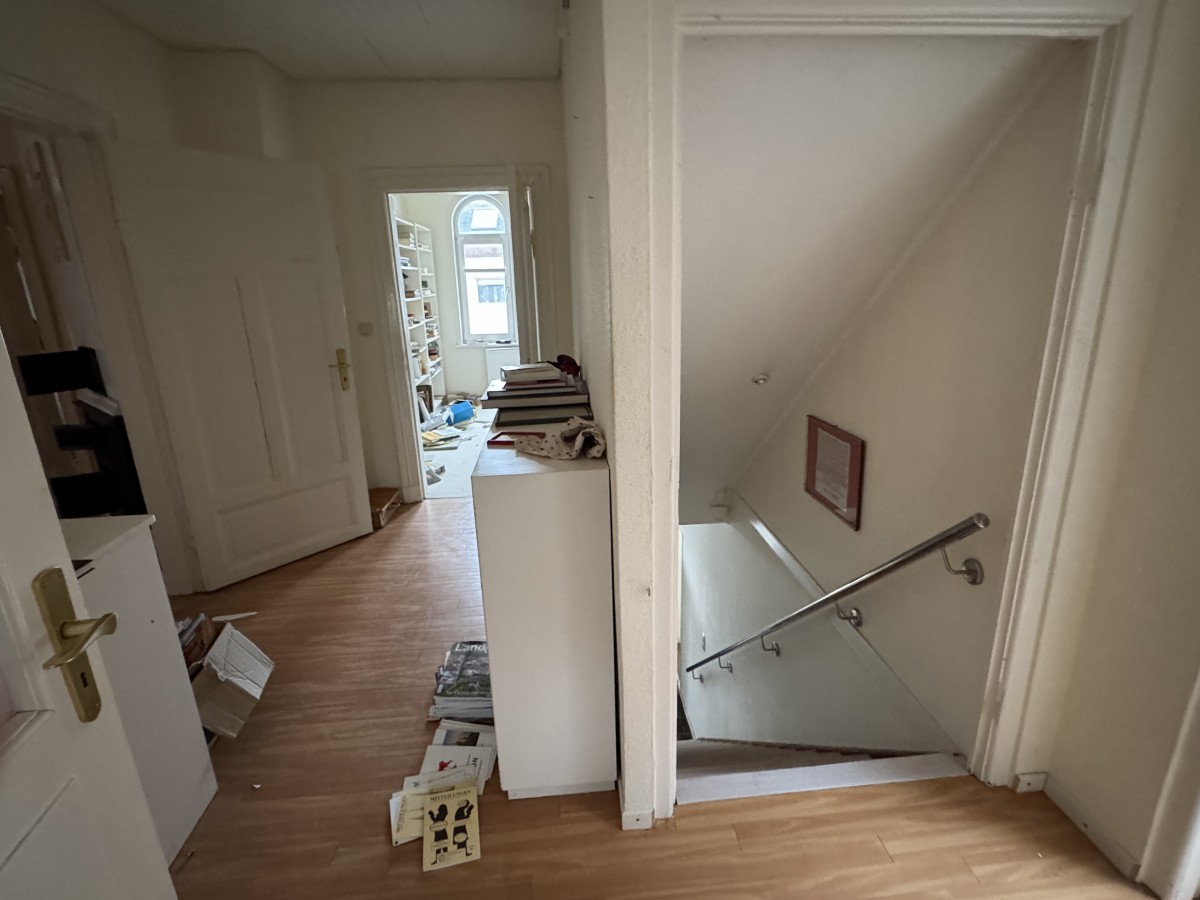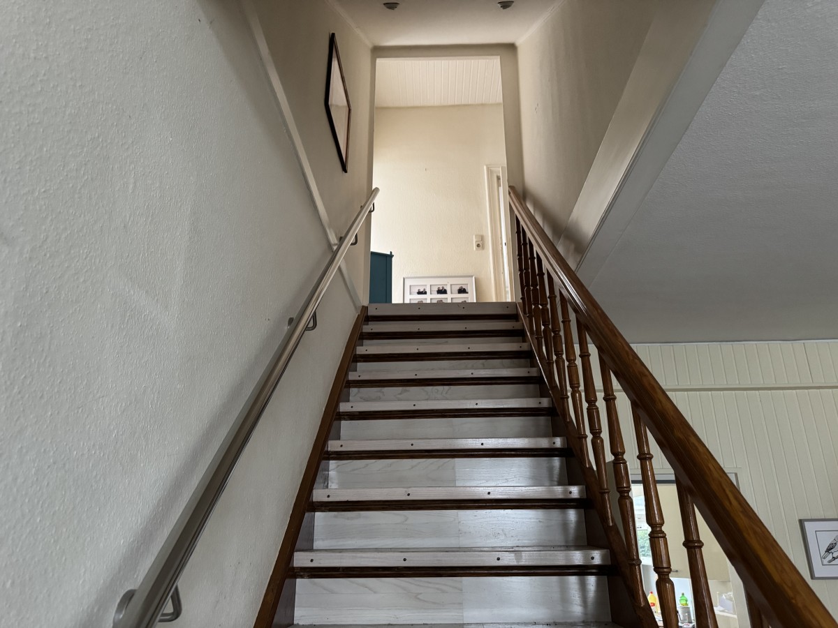 Über die Treppe nach unten sind die teilweise unterkellerten Räume erreichbar. Diese eignen sich als Stauraum, bedürfen jedoch ebenfalls einer Sanierung.