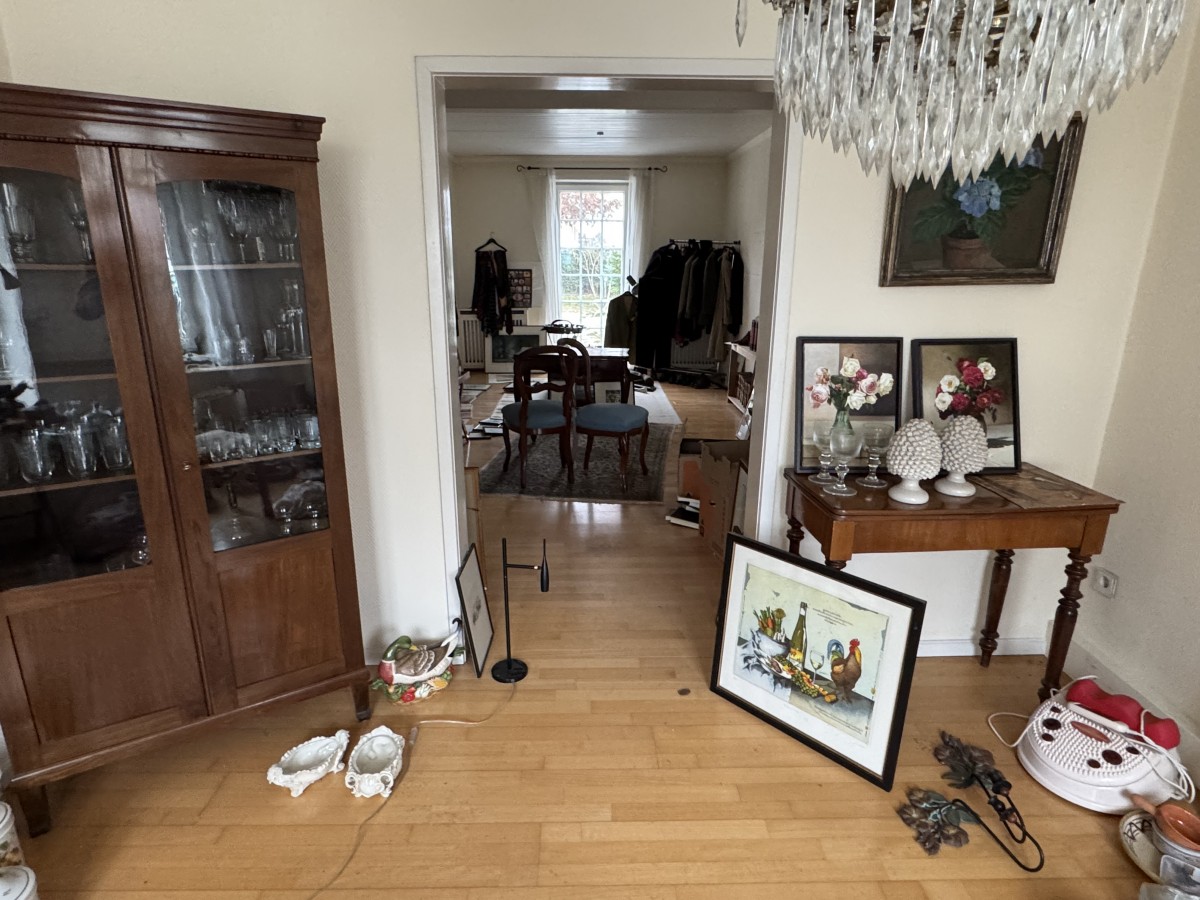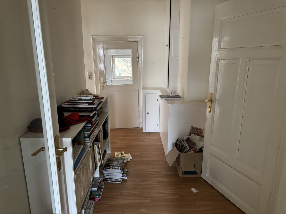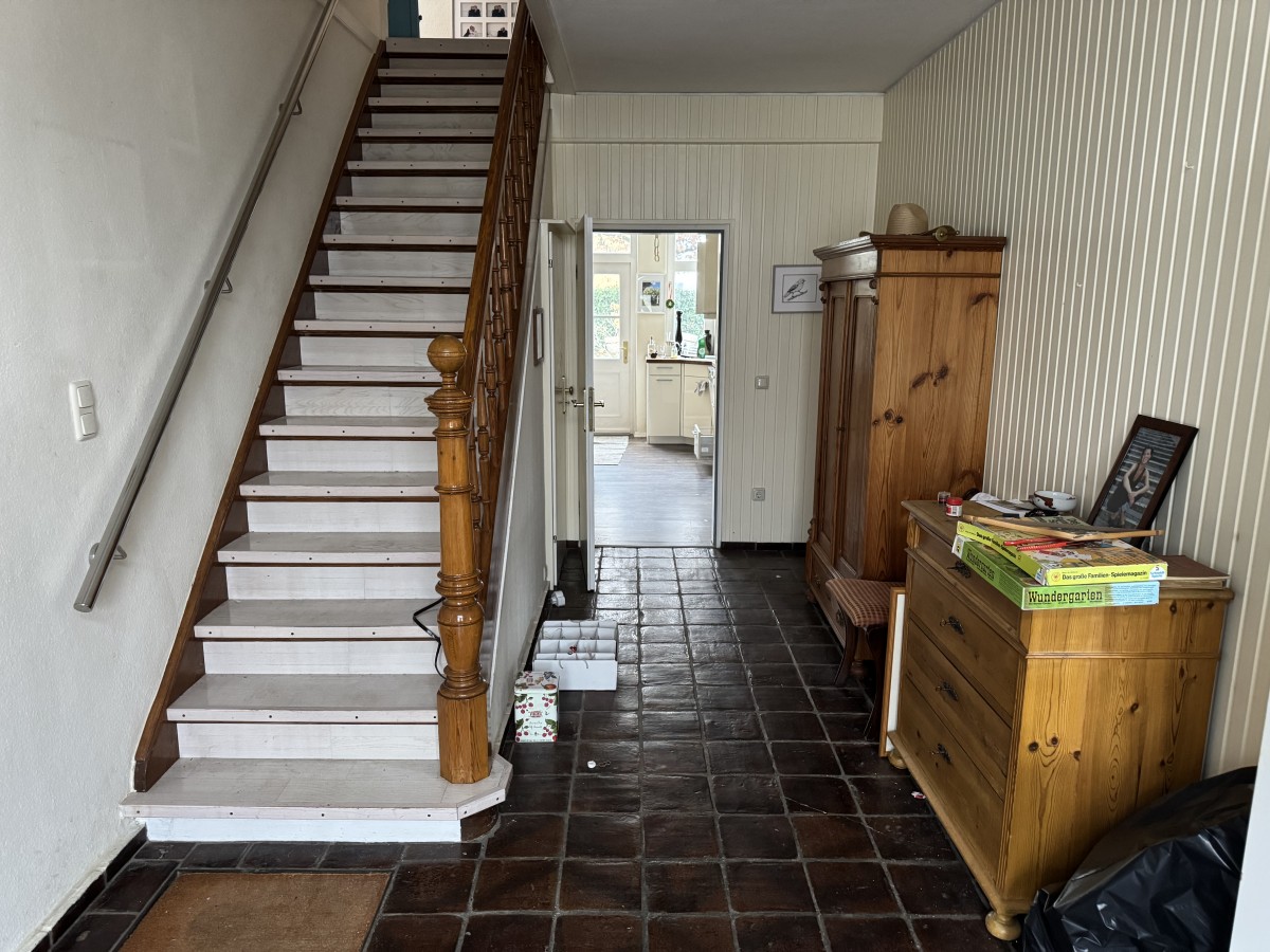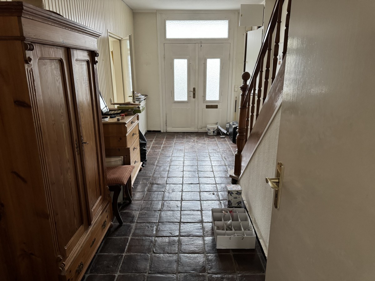 Bereits die doppelflügelige Eingangstür vermittelt einen einladenden Eindruck und führt in einen großzügigen Eingangsbereich mit klassischem Fliesenboden, der dem Haus eine zeitlose und authentische Atmosphäre verleiht. Von hier aus erschließen sich alle Bereiche des Hauses auf angenehme und klare Weise.
