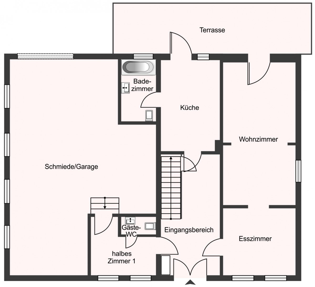 Linker Hand gelangt man zunächst in ein Arbeitszimmer und weiter am Gäste-WC vorbei in den ehemaligen Schmiedebereich. Dieser Teil des Hauses ist besonders eindrucksvoll: Teilweise erhaltenes altes Kopfsteinpflaster gepaart mit einer beeindruckenden Deckenhöhe, erinnern an die Zeit, als hier Kutschen ein- und ausfuhren. Zum Außenstellplatz hin ist noch das originale Tor vorhanden, das nicht nur den historischen Charme unterstreicht, sondern auch eine außergewöhnlich flexible Nutzung dieses Bereichs ermöglicht – sei es als Wohnraum, Atelier, Werkstatt oder kreativer Lebensbereich.