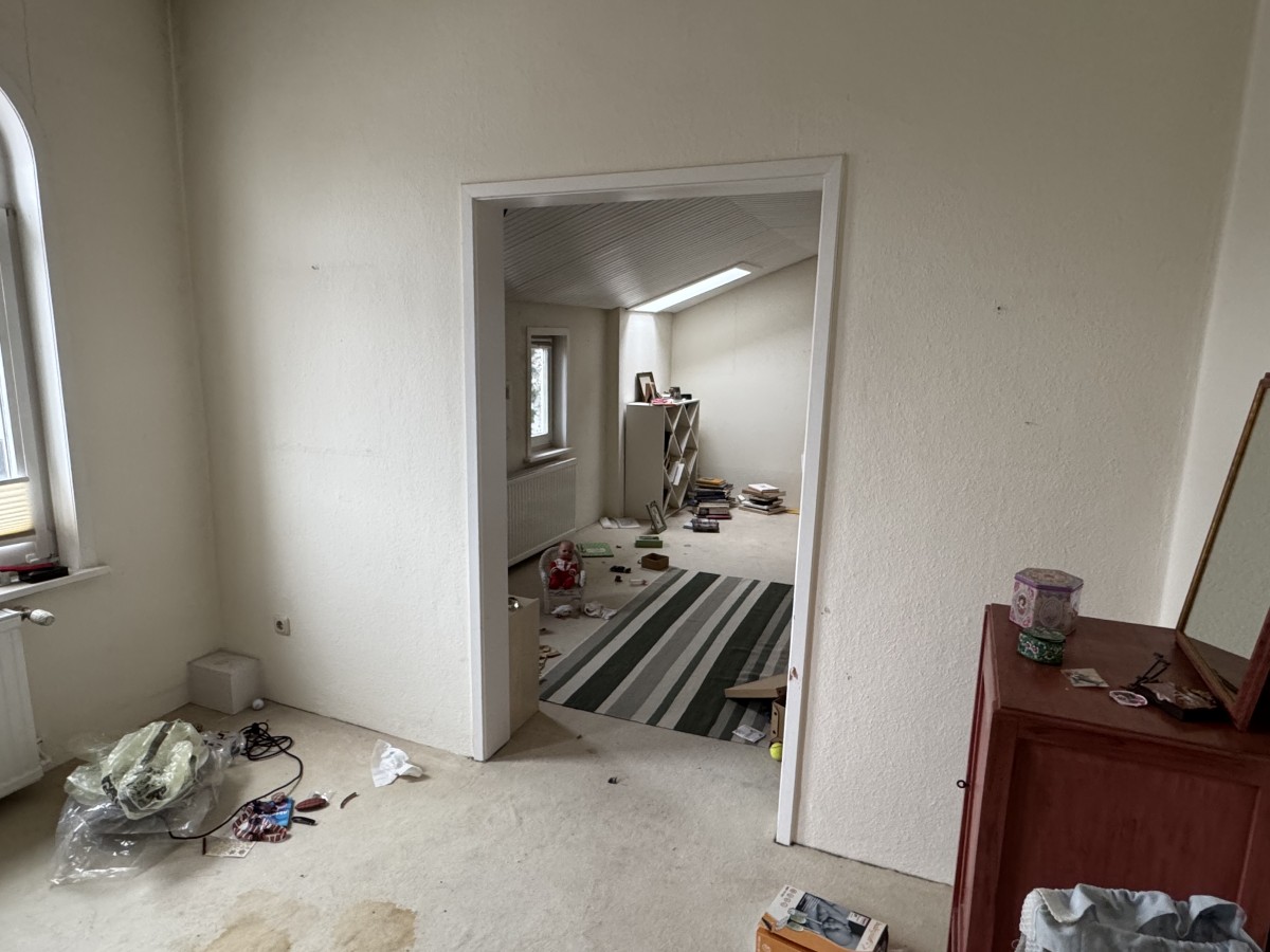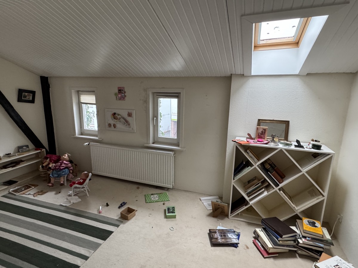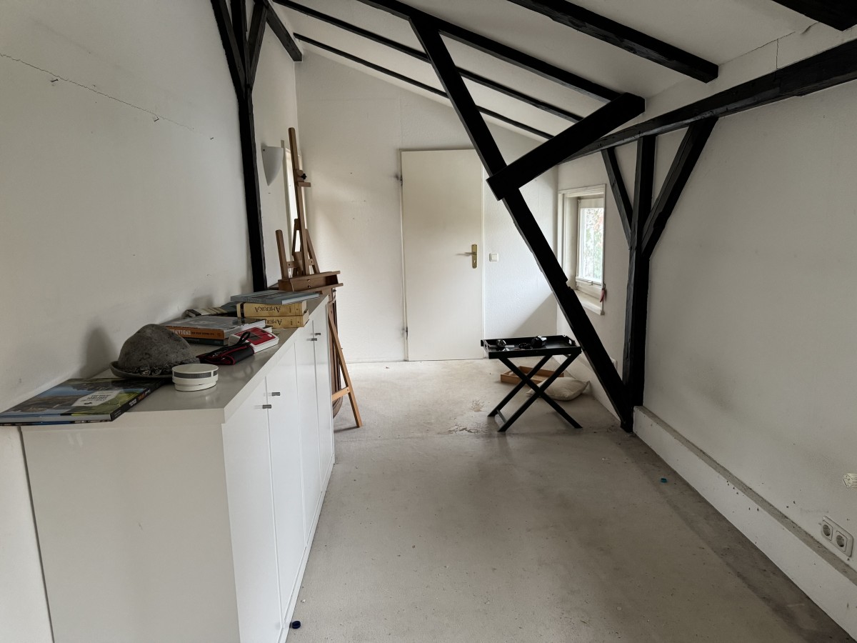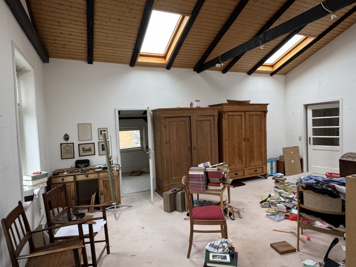 Über die Treppe im Eingangsbereich erreicht man das Dachgeschoss. Links befindet sich hier der größte Raum des Hauses: hell, offen bis unters Dach und mit einer beeindruckenden Raumwirkung. Dieser Bereich eignet sich ideal als zusätzlicher Wohnraum, Atelier oder als besonders großzügiges Schlafzimmer. Weitere vielseitig nutzbare Räume schließen sich an. Ergänzt wird das Dachgeschoss durch ein weiteres Duschbad.