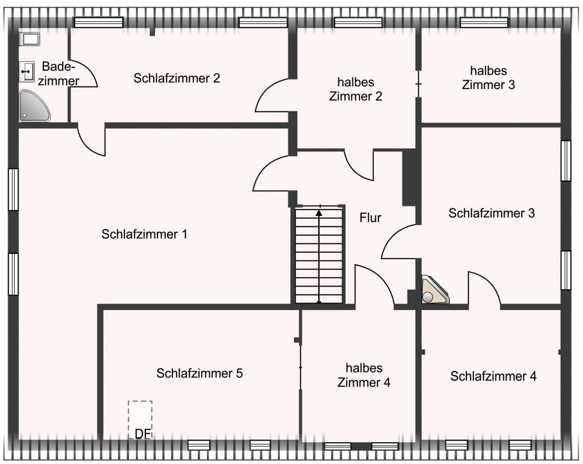 Über die Treppe erschließt sich das Dachgeschoss mit insgesamt fünf ganzen Schlafzimmern sowie drei halben Zimmern. Diese bieten dem neuen Eigentümer eine beeindruckende Vielfalt an Nutzungsmöglichkeiten – ob als Schlaf-, Arbeits-, Gäste- oder Hobbyräume, hier ist Platz für individuelle Lebensentwürfe.