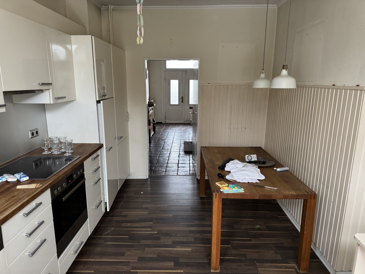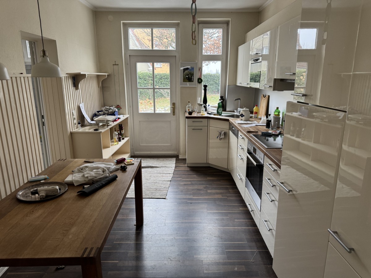 Typisch für die ursprüngliche Bauweise liegt die Küche im mittleren, hinteren Teil des Hauses mit Blick und Zugang zum Garten. Sie ist großzügig geschnitten und mit einer gut ausgestatteten Einbauküche versehen, die ausreichend Platz zum Kochen und Verweilen bietet. Direkt angrenzend befindet sich das Badezimmer des Erdgeschosses. Von der Küche aus gelangt man ebenso wie vom Wohnbereich auf die Terrasse und in den uneinsehbaren Garten.
