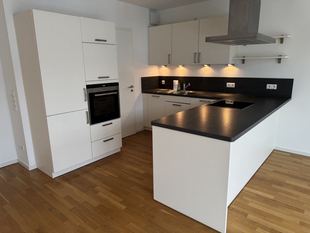 Insgesamt ist die Wohnung mit einer erstklassigen Ausstattung versehen. Hierbei ist die offene Küche sicherlich ein Highlight. Die warme Farbgebung der Küchenschränke, der Tresen mit dem Herd und der Dunstabzugshaube, die hochwertigen Geräte und die Schieferarbeitsplatte überzeugen hier absolut. Darüber hinaus hilft der zweite Abstellraum der Wohnung, der an die Küche angrenzt, beim Verstauen von Vorräten.
