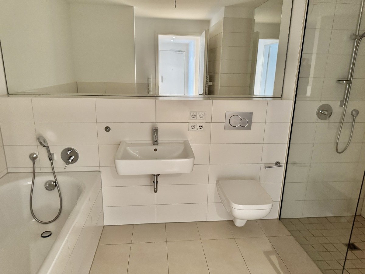 • Badezimmer mit Badewanne, Dusche und Waschmaschinen-anschluss.