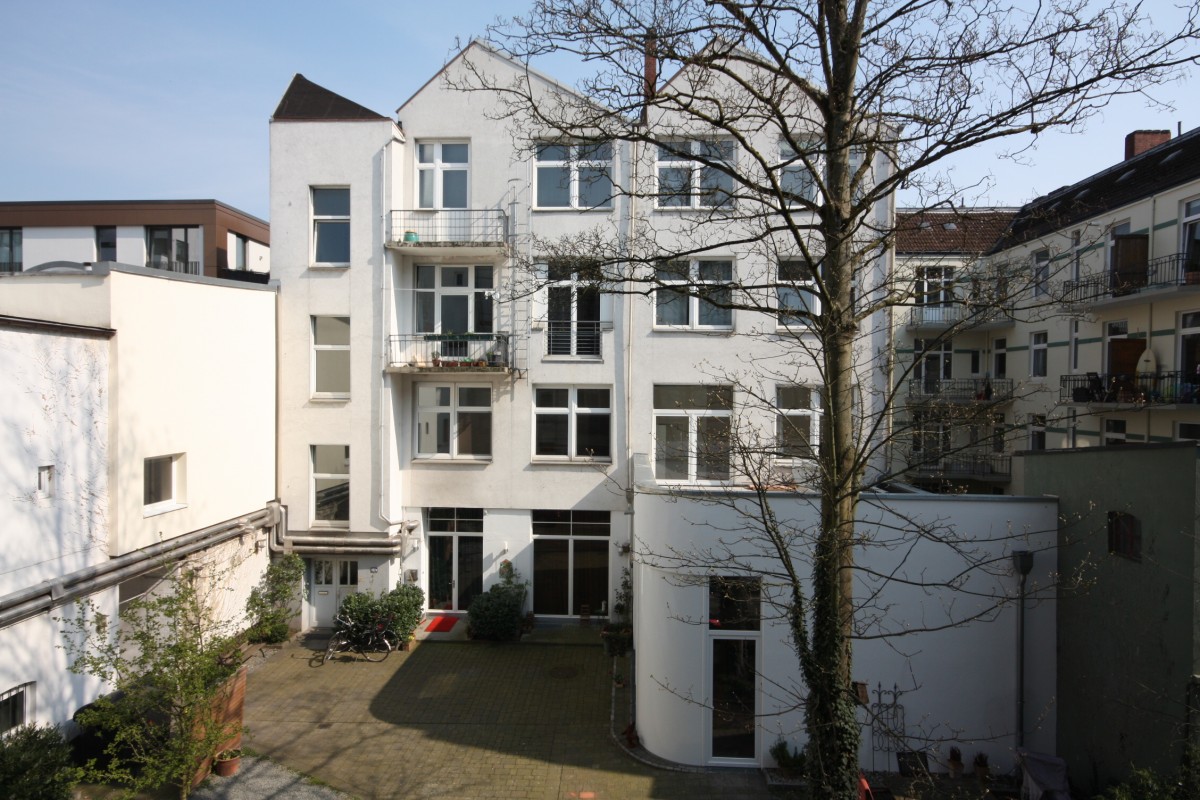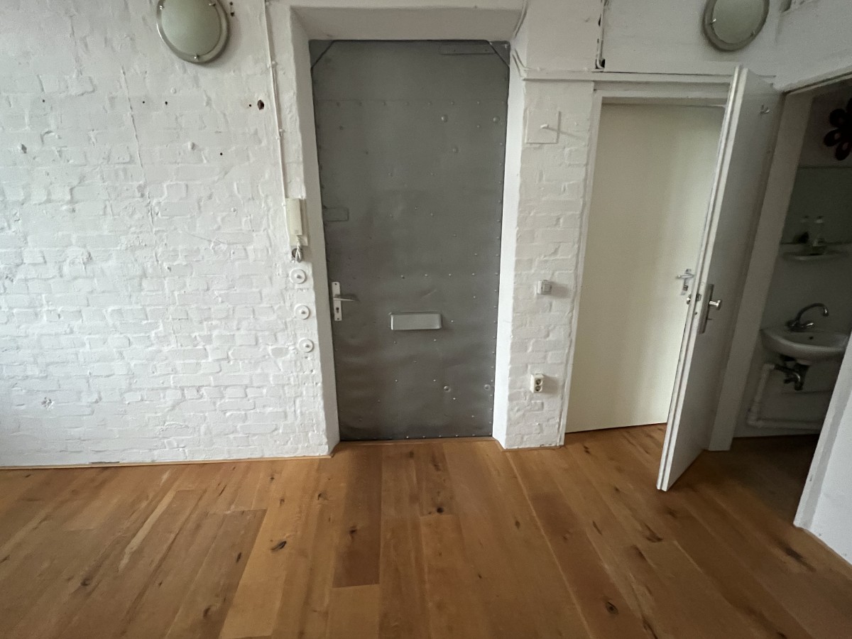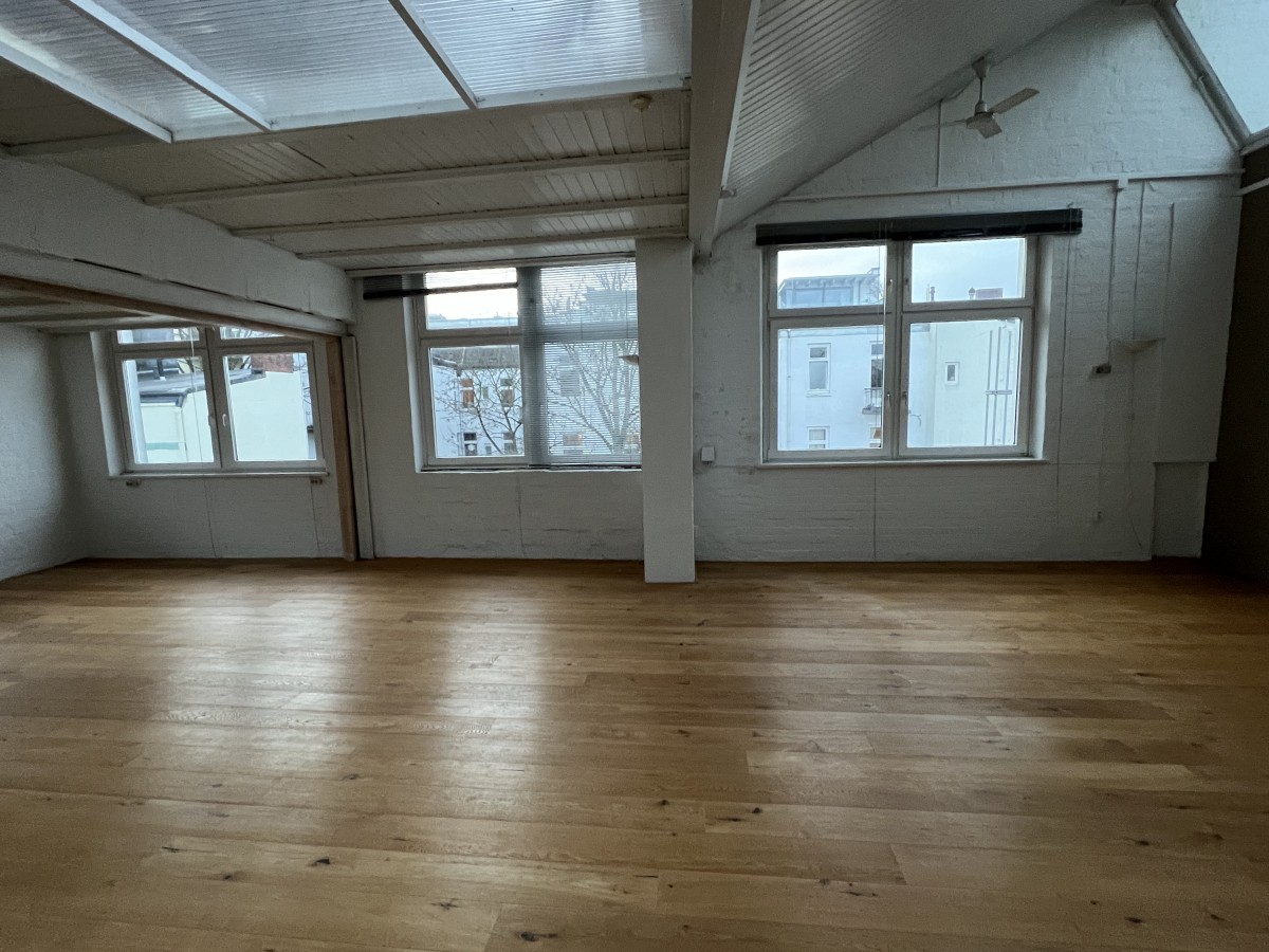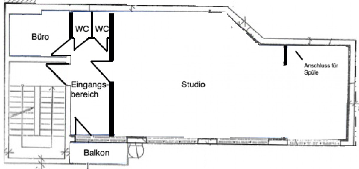 Die gepflegte Gewerbefläche mit Loft-Charakter befindet sich im Dachgeschoss (3. Obergeschoss) des Hinterhauses. Es gibt insgesamt zwei Räume und einen Eingangsbereich. Die gesamte Fläche ist mit einem schönen Holzfußboden ausgestattet. Viele Fenster durchfluten die Räume mit Tageslicht und sorgen für eine angenehme Atmosphäre. Nach dem Betreten der Einheit befinden sich zwei WC´s auf der linken Seite. Die WC´s sind voneinander getrennt und sind jeweils mit einer Toilette und einem an der Wand hängenden Waschbecken ausgestattet. Außerdem gelangen Sie vom Eingangsbereich aus auf den Balkon. Direkt neben der Eingangstür befindet sich ein kleiner Raum, der ebenfalls mit einem Fester ausgestattet ist. Gegenüber gelangen Sie durch eine große Tür in den rund 65 m² großen Hauptraum, der mit Heizkörpern an den Wänden versehen ist. Im hinteren Bereich dieses Raumes befindet sich außerdem eine Spüle.