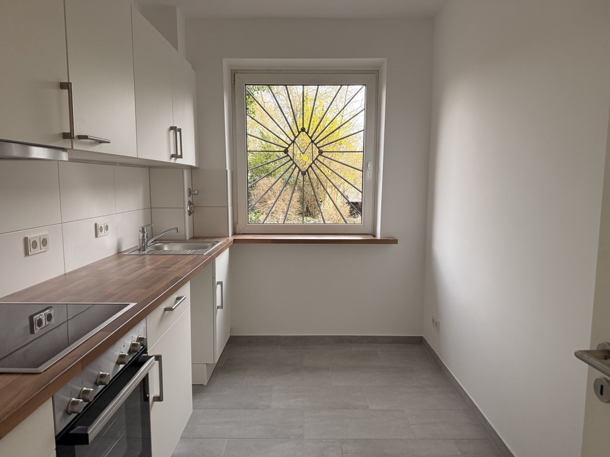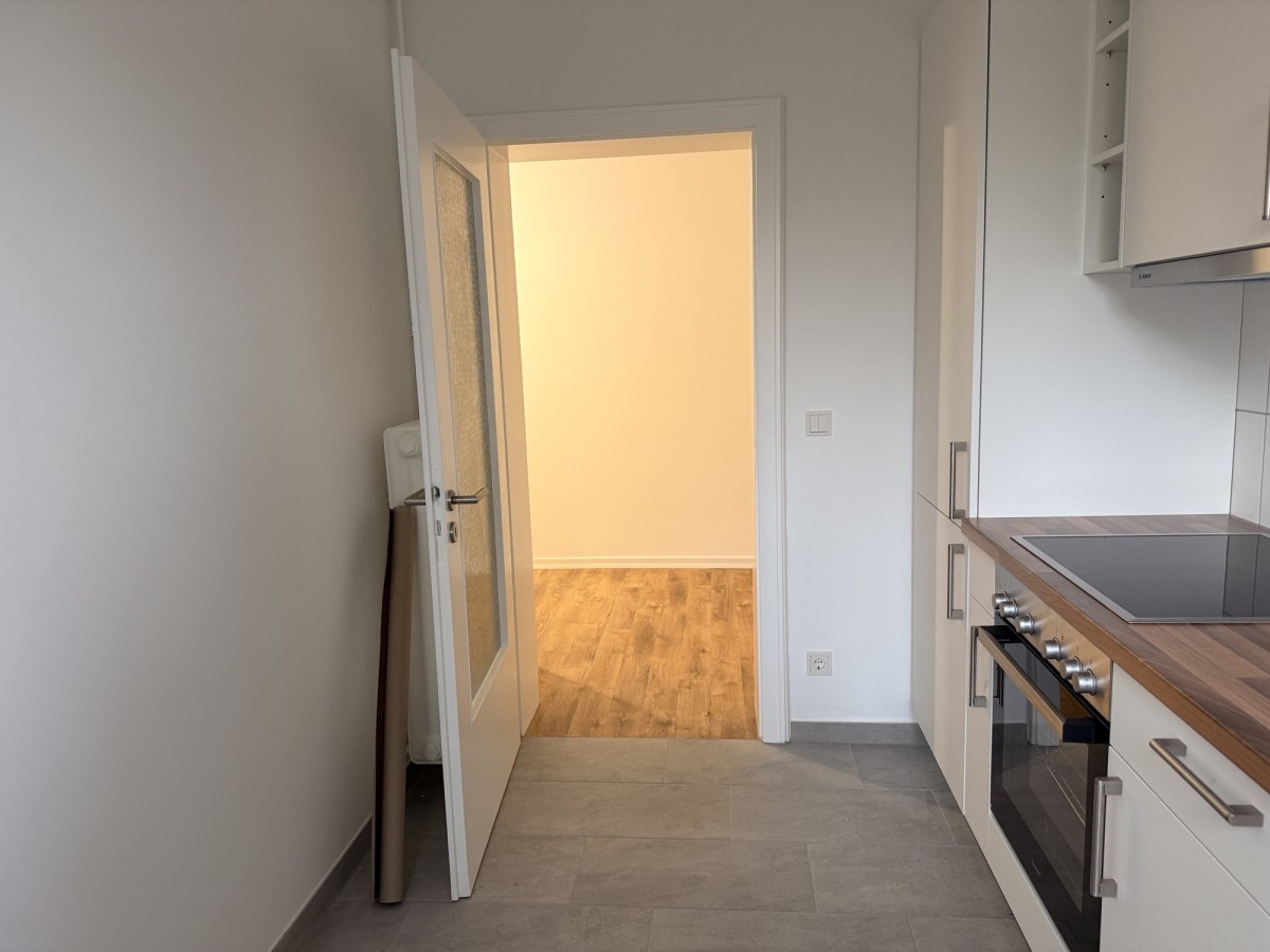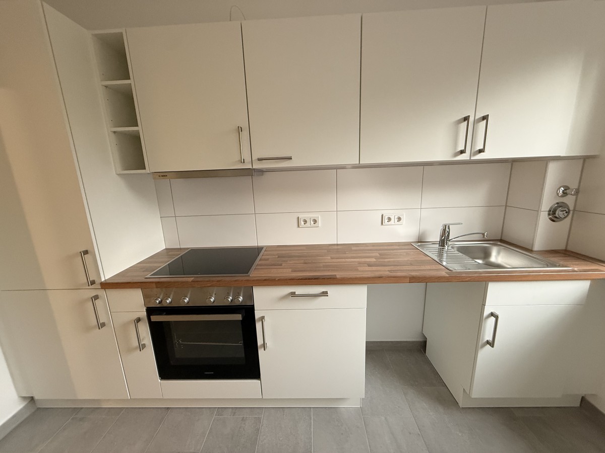 Beim Boden handelt es sich um einen Vinylbelag. Die Küche ist mit einer weißen Einbauküche ausgestattet.